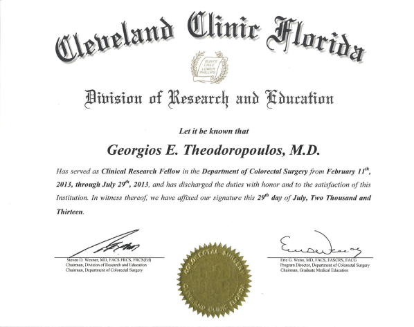 - Οκτώβριος 2004, Διπλωματούχος American Board of Colon & Rectal Surgery