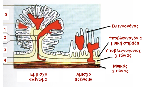 •   Επίπεδο 1: Το καρκίνωμα διηθεί διά της υποβλεννογονίου μυϊκής στιβάδας, αλλά περιορίζεται στην κεφαλή του έμμισχου πολύποδα