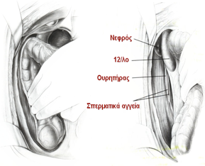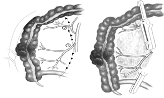 Μετά την αποκάλυψη της ρίζας του δεξιού μεσοκόλου, η δεξιά κολική αρτηρία (παρούσα στο 50% των ασθενών) και τα ειλεοκολικά αγγεία ανασπώνται απομακρυνόμενα από το οπισθοπετιτόναιο. Μία κάθετη τομή διενεργείται στη ρίζα του δεξιού μεσοκόλου ουραίως της 3ης μοίρας του δωδεκαδακτύλου στα δεξιά της άνω μεσεντερίου αρτηρίας. Τα αγγεία απομακρύνονται από το οπισθοπεριτόναιο και η εγγύς απολίνωση λαμβάνει χώρα στην αρχή της ειλεοκολικής αρτηρίας από την άνω μεσεντέριο (Εικόνα 5). Το δεξιό μεσόκολο παρασκευάζεται διαχωριζόμενο από το οπισθοπεριτόναιο με αποτέλεσμα την ανεύρεση του ηπατικού κλάδου της μέσης κολικής αρτηρίας ο οποίος και απολινώνεται. Με ανάλογη παρασκευή με ουραία κατεύθυνση προς τον τελικό ειλεό ανευρίσκονται και απολινώνονται οι ειλεϊκοί αγγειακοί κλάδοι.