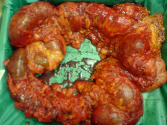 Εικόνα 3. Παρασκεύασμα υφολικής κολεκτομής για πλήρως αποφράσσοντα όγκο κατιόντος κόλου. Ο ασθενής προσήλθε με κλινική εικόνα απόφραξης και στον προεγχειρητικό αξονοτομογραφικό έλεγχο αναδείχθηκε ενδοτοιχωματικός αέρας στο δεξιό κόλον. Διεγχειρητικά η επαπειλούμενη ρήξη του τυφλού οδήγησε στη διενέργεια της υφολικής κολεκτομής και στην αποκατάσταση της συνέχειας του εντέρου με ειλεο-ορθική αναστόμωση