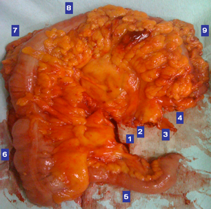 Εικόνα 8. Παρασκεύασμα εκτεταμένης δεξιάς κολεκτομής που έγινε για καρκίνο της μεσότητας του εγκαρσίου κόλου. 1. Ειλεοκολική αρτηρία. 2. Μέση κολική αρτηρία. 3. Ανιόν κλάδος αριστερής κολικής αρτηρίας. 4. Επιχείλιος αρτηρία. 5. Τελικός ειλεός. 6. Δεξιό κόλον. 7. Ηπατική καμπή. 8. Εγκάρσιο κόλον. 9. Σπληνική καμπή