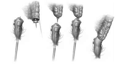 Εικόνα 7. Η ειλεο-εγκαρσία αναστόμωση εκτελείται με τη χρήση κοπτοσυρραπτικών εργαλείων πλάγιο-παλαγίως μεταξύ των αντιμεσεντερικών επιφανειών των δύο εντερικών κολοβωμάτων