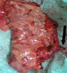 Εικόνα 5. Τμήμα παρασκευάσματος δεξιάς κολεκτομής. Η ειλεοκολική αρτηρία απολινώνεται στην εκφυσή της από την άνω μεσεντέριο αρτηρία (βέλος)