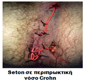 Το seton είναι ένα ελαστικό νήμα που τοποθετείται καθ’ όλο το μήκος της πορείας του συριγγίου, ενώ ταυτόχρονα τα άκρα του δένονται μεταξύ τους, σχηματίζοντας έτσι ένα δακτύλιο γύρω από το τμήμα εκείνο του πρωκτικού σφιγκτήρα που έχει προσβληθεί από το συρίγγιο. Το seton μπορεί να αφεθεί στη θέση του επί μακρόν και επ' αόριστον σε επιλεγμένες περιπτώσεις, με σκοπό την ελεγχόμενη παροχέτευση, επιτρέποντας, έτσι, τη φλεγμονή να υποχωρήσει προοδευτικά. Σύμφωνα με τις διεθνείς κατευθυντήριες οδηγίες, ο συνδυασμός του seton με τη χορήγηση του βιολογικού παράγοντα (Infliximab) μπορεί να οδηγήσουν στην επούλωση του μεγαλύτερου ποσοστού των περιπρωκτικών συριγγίων στη νόσο Crohn, για αυτό ο εξειδικευμένος χειρουργός πρέπει να καλείται από νωρίς στις περιπτώσεις σοβαρής προσβολής του πρωκτού, πριν ακόμη από την έναρξη του βιολογικού παράγοντα.