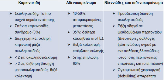 - Κλινικές εκδηλώσεις οξείας σκωληκοειδίτιδας, καρκινοειδές σύνδρομο, ψηλαφητή κοιλιακή μάζα, ασκίτης σε βλεννοπαραγωγά νεοπλάσματα.