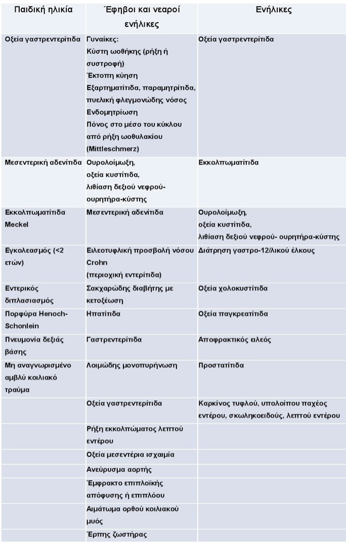 Διαφορική διάγνωση της οξείας σκωληκοειδίτιδας ανάλογα με την ηλικία