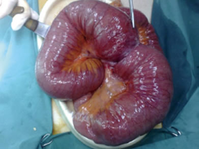Διεγχειρητική εικόνα (Α) και χειρουργικό παρασκεύασμα ευρείας εντερεκτομής (Β) σε αδενοκαρκίνωμα λεπτού εντέρου που προκάλεσε αποφρακτικό ειλεό