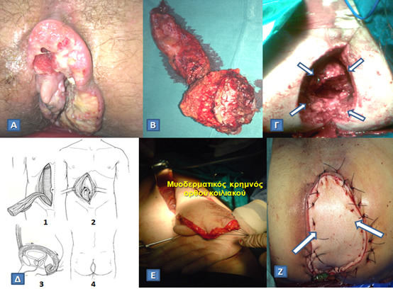Δ. Δημιουργία κάθετου μυοδερματικού κρημνού ορθού κοιλιακού (Vertical Rectum Abdominis Muscle, VRAM flap) για την κάλυψη του περινεϊκού ελλείμματος (1. Αποκόλληση του μυοδερματικού κρημνού του ορθού κοιλιακού από την οπίσθια περιτονία. 2. Διεκβολή του κρημνού διά της οπίσθιας θήκης και του περιτοναίου εντός της πυέλου. 3. Καθήλωση του μυοδερματικού κρημνού στο περίνεο. 4. Τελικό αποτέλεσμα).